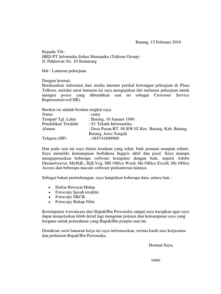 Contoh surat lamaran kerja di pt telkomsel sebagai customer service.